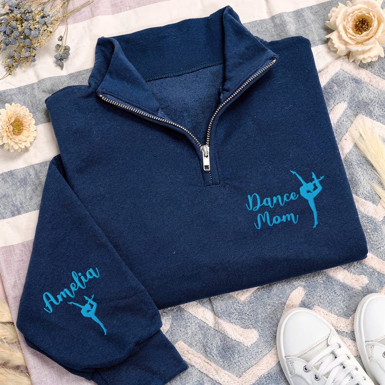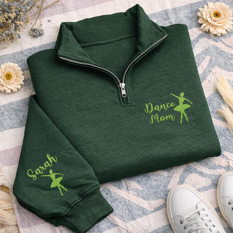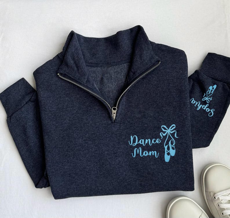 Dance Mom Quarter Zip Sweatshirt, Embroidered Name Sleeve Pullover, Custom Ballet Mom Gift, Dance Competition Unisex Zip Squad Jacket Wear
