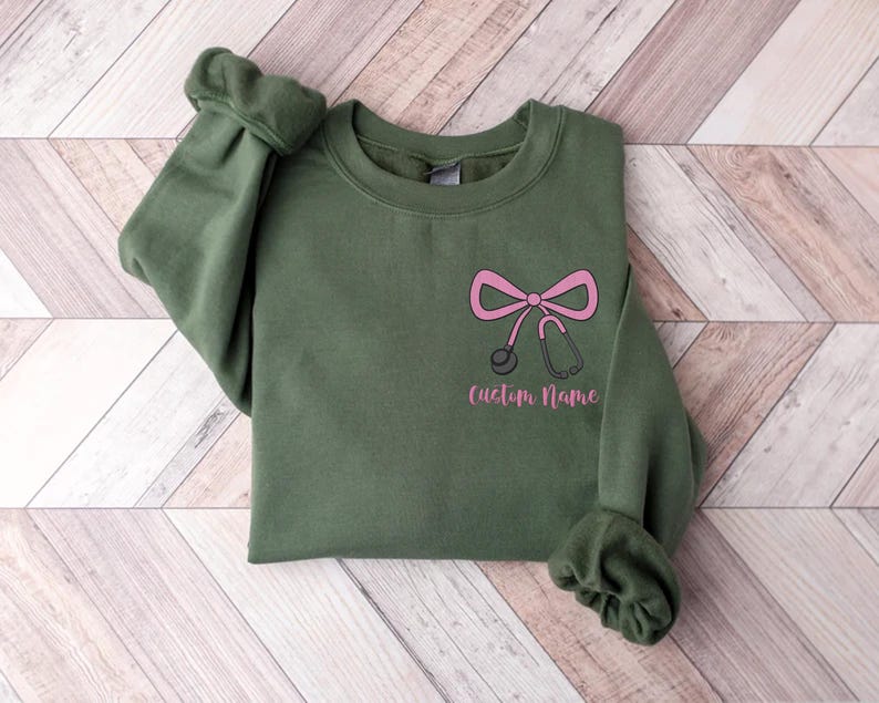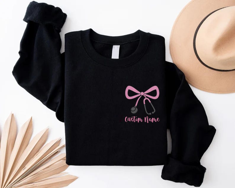The Custom Nurse Embroidered Sweatshirt, bow and stethoscope hoodie, personalized nurse shirt, and healthcare long sleeve shirt are designed to celebrate nurses and healthcare heroes in style. Featuring delicate embroidery with a bow and stethoscope detail, these pieces combine comfort with professional pride. Made to order with high-quality stitching, they make a thoughtful gift for nurses, doctors, medical students, and healthcare workers—perfect for graduations, appreciation gifts, or everyday wear.