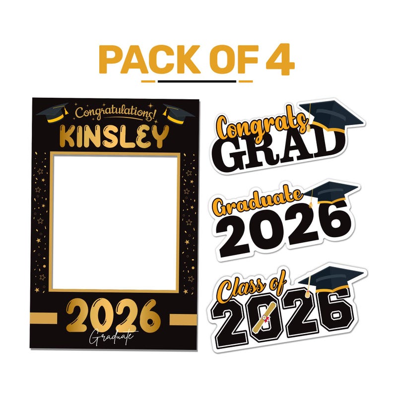 Instant Party Decoration: With This 4-Pack of Personalized Graduation 2026 Selfie Frame Photo Booth Props Class of 2026, Congrats Grad, 2026 Graduate Cutout Sign Graduation Party You Can Instantly Transform Your Party Into a Celebration Worth Remembering. Perfect for Graduation Parties, These Props Are Sure to Be a Hit With Guests of All Ages.