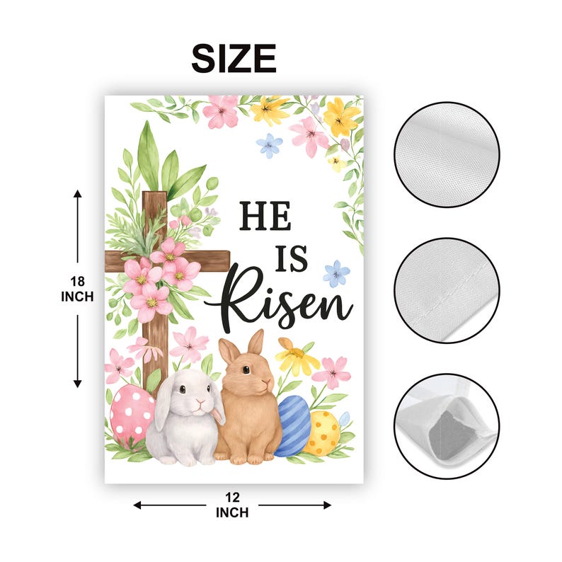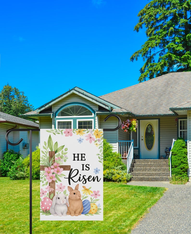 He Is Risen Cross & Bunny Garden Flag, Floral Christian Easter Yard Sign, Resurrection Sunday Porch Decor, Spring Faith Outdoor Banner