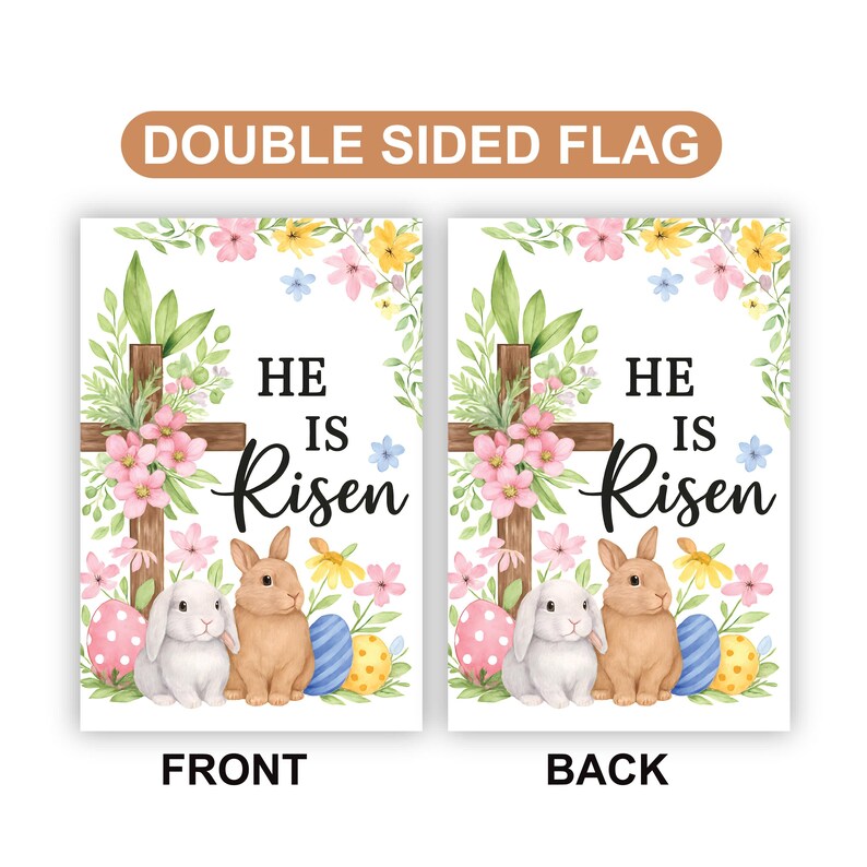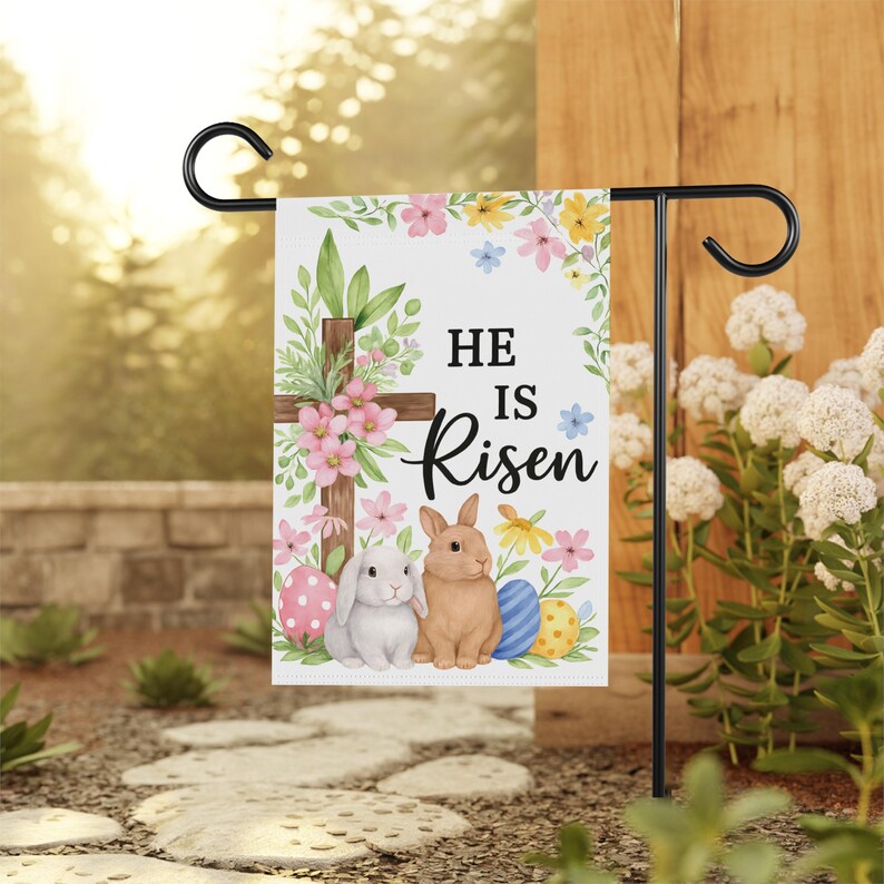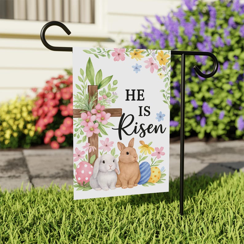 Celebrate the joy of Resurrection Sunday with this He Is Risen Garden Flag, featuring a wooden cross wrapped in spring florals, pastel Easter eggs, and two sweet bunnies gathered at the base.