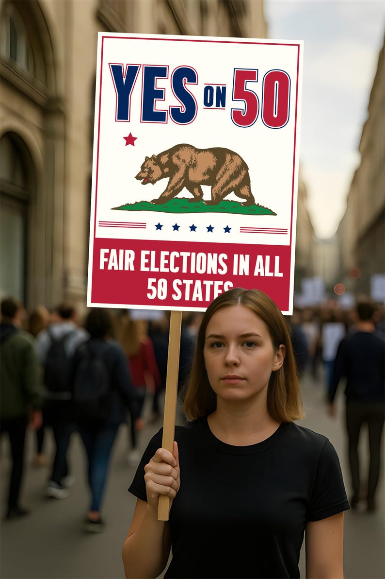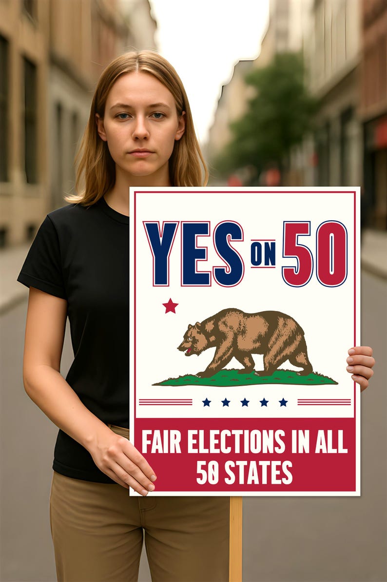 Make your voice heard with this Yes on Prop 50 Protest Sign. Designed to highlight the Election Rigging Response Act and take a stand against gerrymandering in California, this bold activist poster is ideal for rallies, marches, and community events. Its eye-catching design ensures your message is clear and powerful.